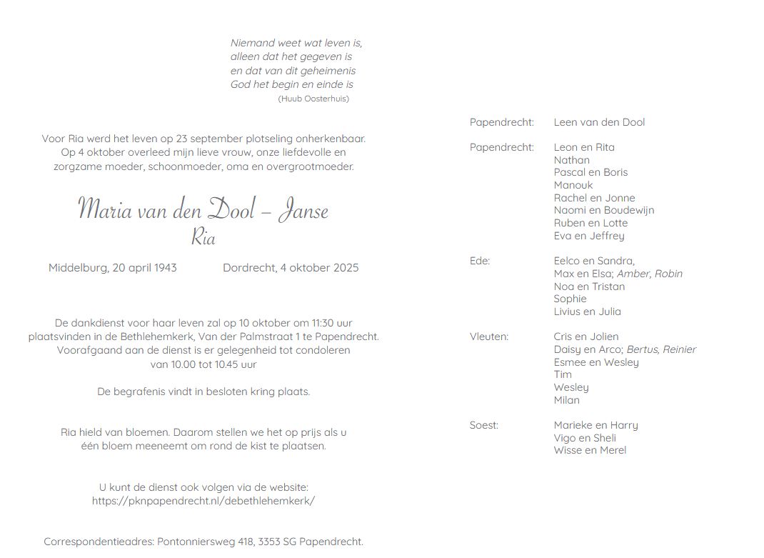 Zaterdag 4 oktober overleed Ria van den Dool op 82-jarige leeftijd.