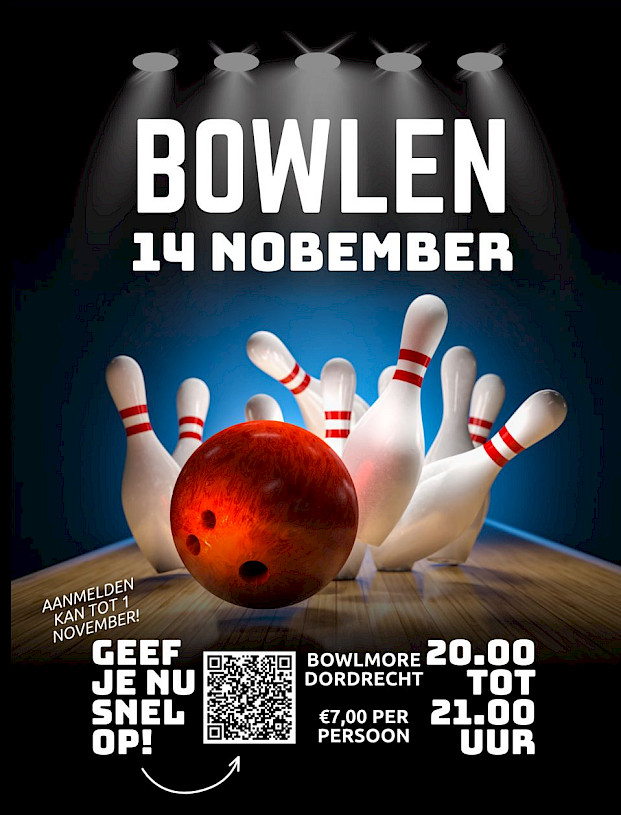 Vrijdag 14 november 20:00 - 21:00 uur Bowling & Partycentrum de Merwehal/Bowlmore, Dordrecht Aanmelden tot 3 november KOSTEN: € 7,- (kosten ter plekke te voldoen) |