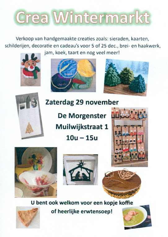 Kom gezellig langs op 29 november tussen 10 uur en 15 uur op de Crea Wintermarkt en warm ook even bij ons op met een kopje koffie/thee met wat lekkers, of een heerlijke kom erwtensoep.