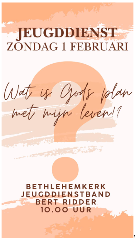 Vandaag vieren we een jeugddienst, het gaat over ‘Gods plan met mijn leven’. Is er dan een plan met mijn leven? En hoe ziet dat eruit? Hoe kom ik achter dat plan? Bepaalt God van minuut tot minuut mijn leven, of… Genoeg vragen om over na te denken! De jeugddienstband zorgt voor de muziek en begeleidt de liederen. Goed plan toch?!